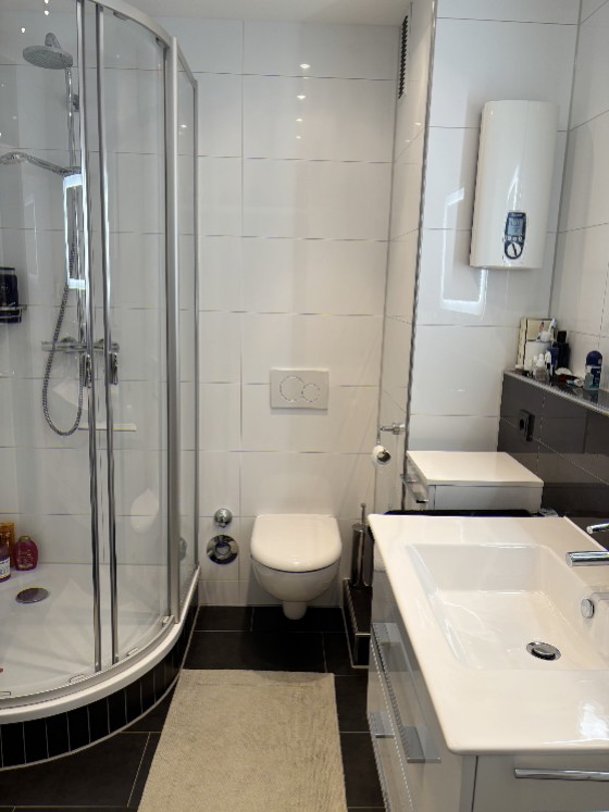 Eingebettet in viel Grün (wenn es nicht gerade Herbst oder Winter ist) liegt ein 1984 gebautes, Wohnhaus mit 4 Etagen und Dachgeschoss. Der helle Naturstein der Fassade signalisiert angenehmen Wohnkomfort. Alle Wohnungen, ob groß oder klein, sind mit Balkonen ausgestattet. Im Hausinneren – alles tiptop gepflegt – befinden sich ein Lift, die Kellerräume, ein Fahrradraum und der Zugang zur Tiefgarage. Ein Hausmeisterservice kümmert sich um die Belange des Hauses und der Mieter. Der Lift bringt Sie von der Tiefgarage bis vor die Wohnungstür. Vom Flur gehen das Wohnzimmer mit überdachtem Balkon, die Einbauküche, das Gäste-WC, ein Abstellraum und das Schlafzimmer ab. Vom Schlafzimmer aus gelangen Sie in das großzügige Masterbad.Ausstattung