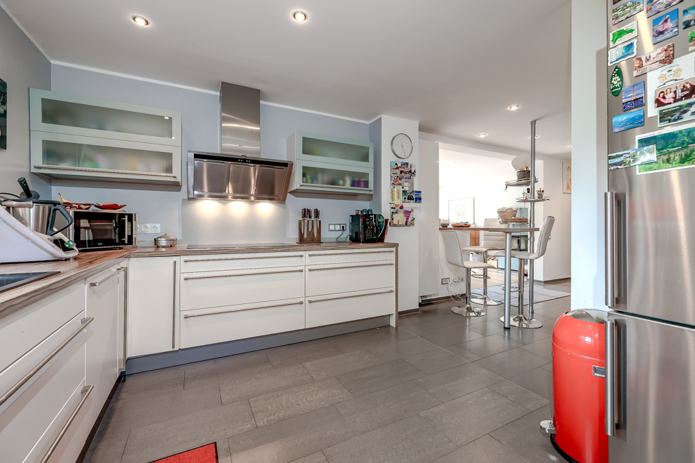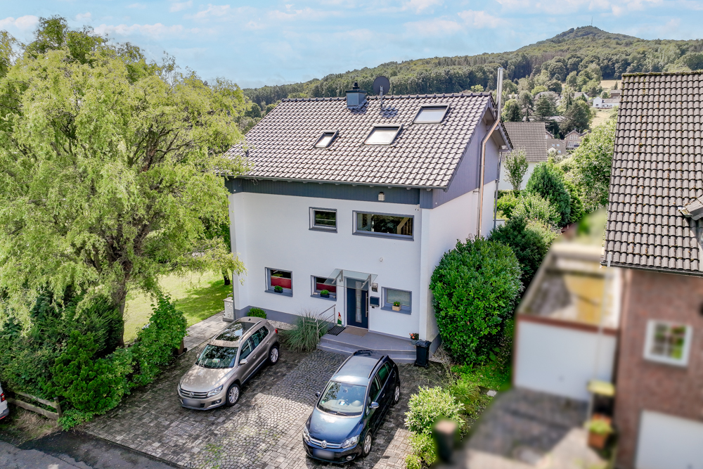Dieses freistehende Einfamilienhaus wurde 1976 erbaut und ab 2011 umfassend modernisiert. Es überzeugt durch seine ruhige Lage, den großzügigen Grundriss und ein gepflegtes, 833 m² großes Grundstück. Auf rund 196 m² Wohnfläche sowie ca. 80 m² zusätzlicher Nutzfläche erwarten Sie fünf gut geschnittene Zimmer, zwei Badezimmer, zwei Balkone und viele durchdachte Details – ideal für Familien, die Wert auf Komfort und ein behagliches Wohnumfeld legen. Das Haus präsentiert sich in einem modernen und gepflegten Zustand. Ein besonderes Highlight ist der große Wintergarten, der als Essbereich an den Wohnraum anschließt und für eine offene, einladende Atmosphäre sorgt. Große Fensterfronten schaffen helle Räume und einen wunderbaren Blick in den eigenen Garten. Die 2022 erneuerten Fenster, eine Gasheizung (Baujahr 2014) mit Fußbodenheizung im Erdgeschoss, die Einbauküche sowie ein Kamin ergänzen die hochwertige Ausstattung. Zudem wurden alle Leitungen, Böden und das Dach erneuert. Die Raumaufteilung ist funktional und familiengerecht gestaltet. Im Erdgeschoss befinden sich das helle Wohnzimmer, die moderne Küche sowie der großzügige Wintergarten mit Zugang zur Terrasse. Ein Gäste-WC rundet den Grundriss auf dieser Etage ab. Im Obergeschoss stehen Ihnen zwei Schlafzimmer und ein Balkon mit herrlicher Fernsicht zur Verfügung. Ein stilvolles Badezimmer mit Doppelwaschbecken, Wanne und Dusche mit flachem Einstieg sowie ein separates WC vervollständigen das Raumangebot auf dieser Etage. Im Jahr 2011 erfolgte eine umfangreiche Sanierung: das komplette Dach wurde abgetragen und eine neue Etage aufgestockt. Dadurch wurde ein völlig neuer Dachbereich mit Gauben geschaffen. Hierbei entstanden 52,85 m² Wohnfläche im Dachgeschoss, die sich auf zwei Zimmer, einen Flur, ein Bad und eine Loggia mit Siebengebirgsblick verteilen. Zudem gibt es noch einen Bereich, welcher über Küchenanschlüsse verfügt. *Fortsetzung: Siehe Ausstattung*Ausstattung
