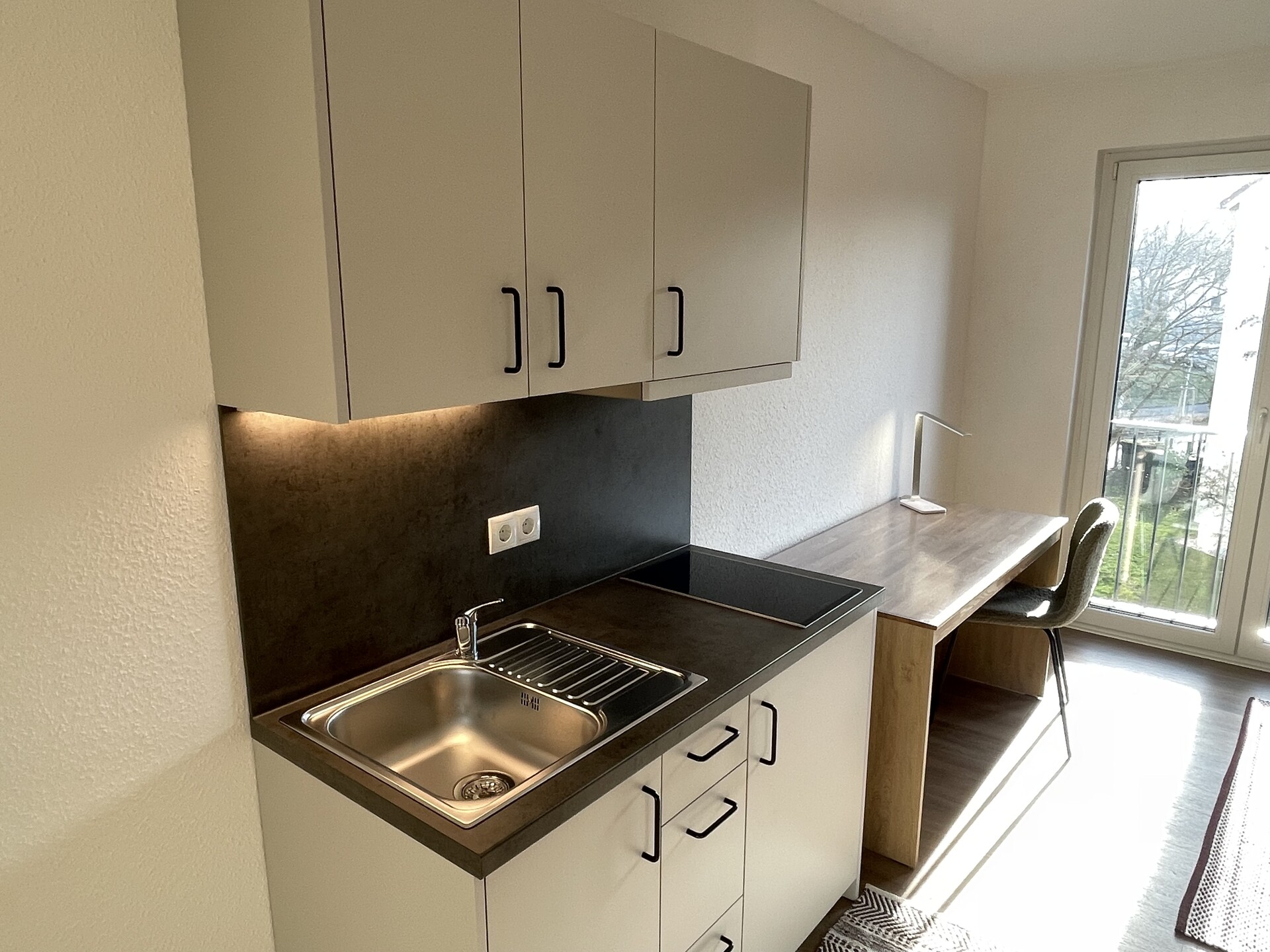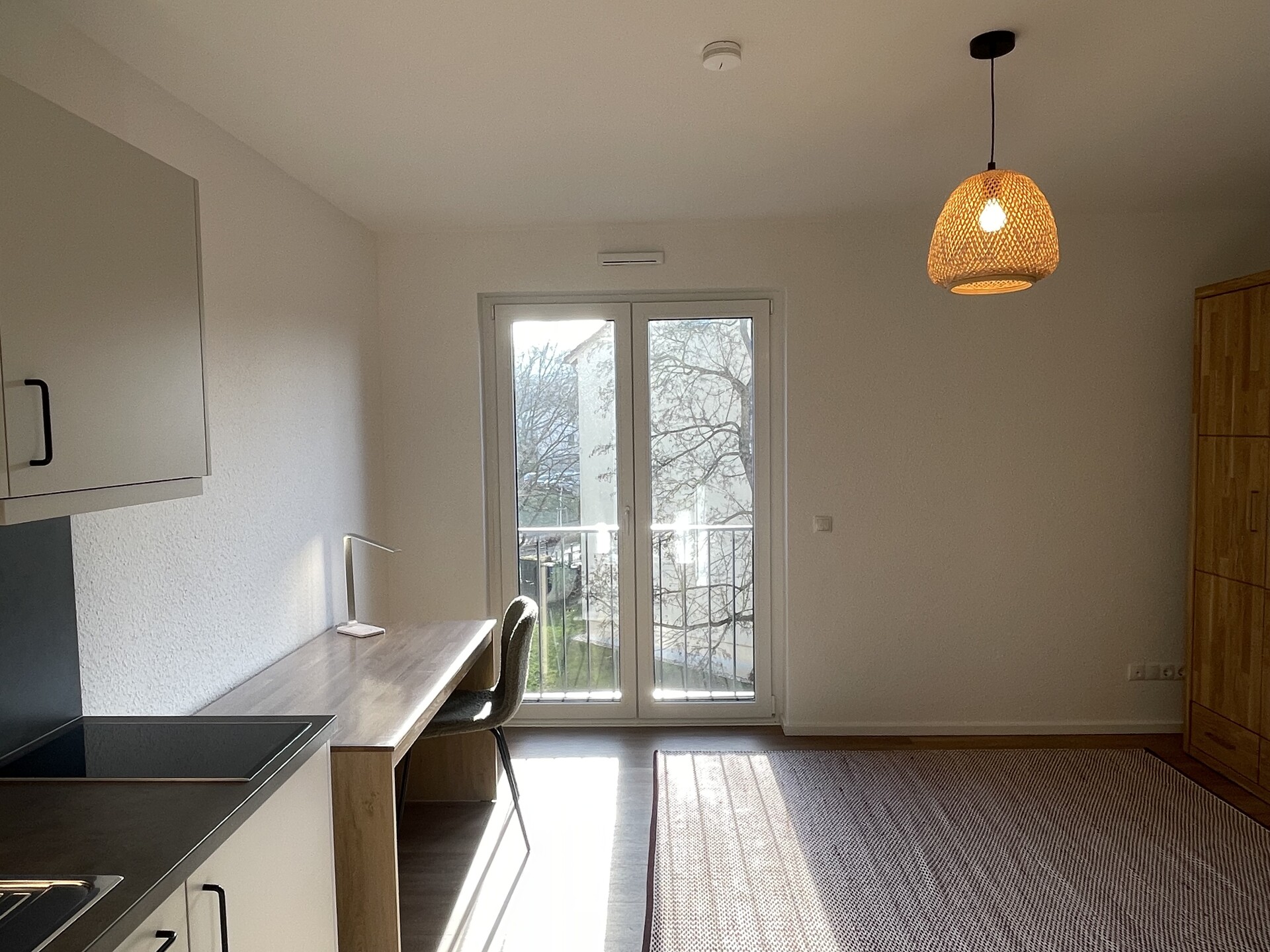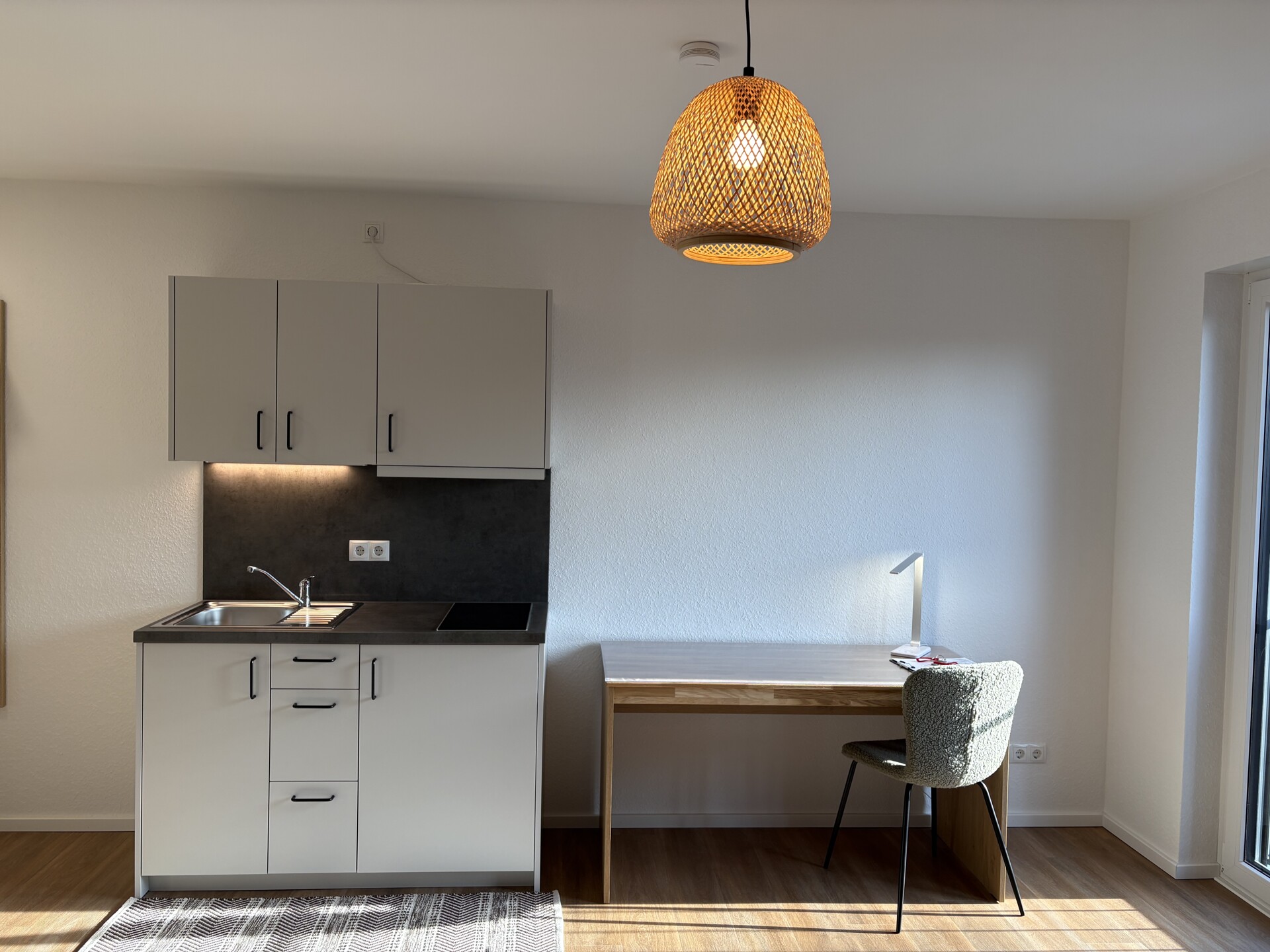 Ihr neues Zuhause – urban, modern und ideal auf das Studentenleben abgestimmt. Dieses frisch fertiggestellte 1-Zimmer-Apartment befindet sich in einem modernen Neubau-Studentenwohnheim und ist ausschließlich für Studierende vorgesehen. Das Apartment eignet sich ideal für eine Person und überzeugt durch eine durchdachte Raumaufteilung, eine praktische Pantryküche, ein eigenes Bad sowie eine angenehme Fußbodenheizung für die kälteren Tage. Ein Aufzug bringt Sie bequem in alle Etagen – besonders praktisch, wenn es einmal mehr zu tragen gibt. Die Wohnung ist vollständig möbliert und hochwertig ausgestattet mit einem Bett, einem Kleiderschrank, einer Garderobe, einem Schreibtisch sowie einem Stuhl. Hier heißt es: einziehen und wohlfühlen. Gemeinschaftsflächen: Auf der Gartenseite des Hauses steht den Bewohnern ein ansprechend gestalteter Gemeinschaftsbereich mit überdachtem Fahrradstellplatz, modernen Crossfit-Geräten und gemütlichen Sitzgelegenheiten zur Verfügung. Dieser lädt zum Verweilen oder zum Austausch mit anderen Bewohnern ein. Im Erdgeschoss befindet sich ein Gemeinschaftsraum, der sich ideal zum Lernen oder Zusammensein eignet. Waschmaschinen und Trockner stehen im Untergeschoss zur gemeinschaftlichen Nutzung bereit. Ein eigenes Kellerabteil ist ebenfalls vorhanden. Wichtige Hinweise: – Das Wohnheim ist ausschließlich Studierenden vorbehalten – Haustiere sind nicht gestattet – Es handelt sich um eine Nichtraucherwohnung – Bei einigen Abbildungen handelt es sich um Beispielbilder der spiegelverkehrten NachbarwohnungAusstattung